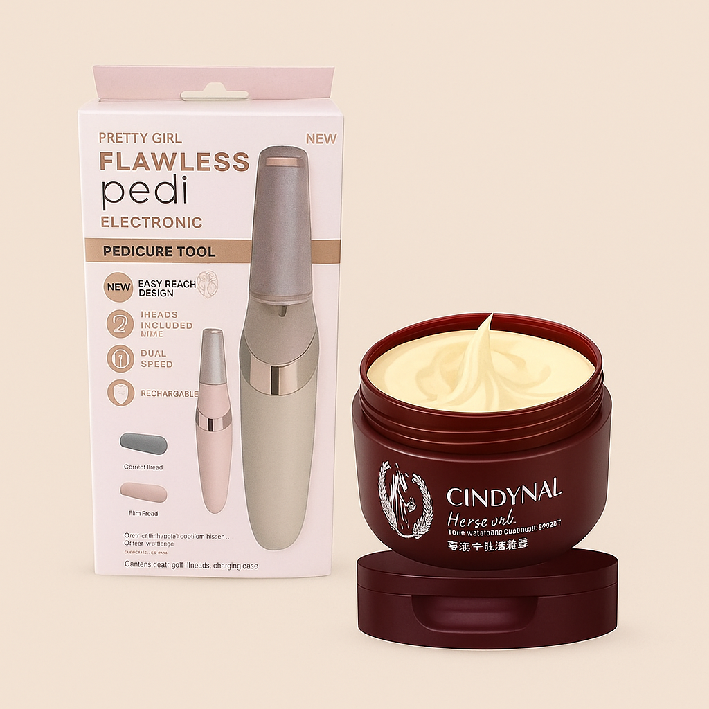 Le Flawless Pedi est un gadget esthétique hautement valorisé visuellement . La crème CINDYNAL à l’huile de cheval est peu connue mais perçue comme riche, efficace, premium